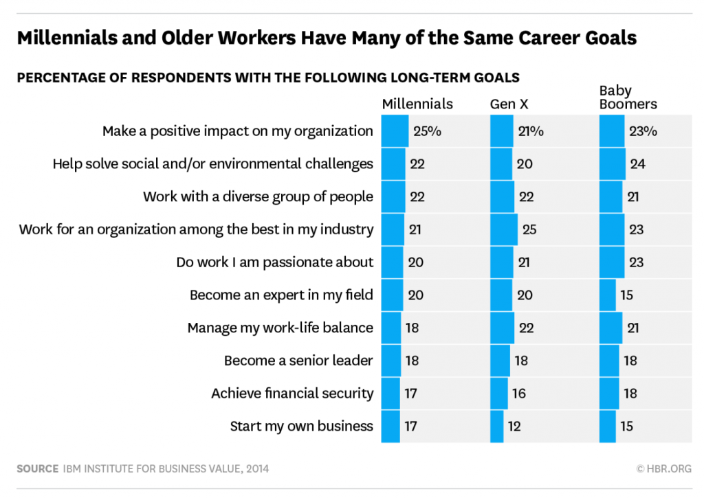 Incluso los estereotipos más ampliamente aceptados sobre los Millennials parecen ser sospechosos. El año pasado, el Instituto de Valor Empresarial de IBM publicó un informe titulado «Mitos, exageraciones y verdades incómodas: la verdadera historia detrás de los millennials en el lugar de trabajo«. Basado en un estudio multigeneracional de 1.784 empleados de empresas de 12 países y seis industrias, encontró que aproximadamente el mismo porcentaje de Millennials (25%) quiere tener un impacto positivo en su organización como Gen Xers (21%) y Baby Boomers (23%). Las diferencias son uniformemente mínimas en otras nueve variables también.