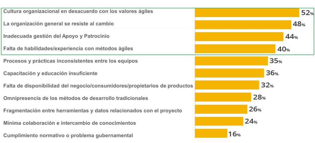 Como podemos observar en este gráfico del State of Agile Agile Report que publicó Collab.net, los principales desafíos en la implementación de agilidad en las organizaciones son: cultura inconsistente con el mindset agile, resistencia de la organización por no entender el para qué, poco apoyo de sponsors y ejecutivos, falta de experiencia en agilidad.