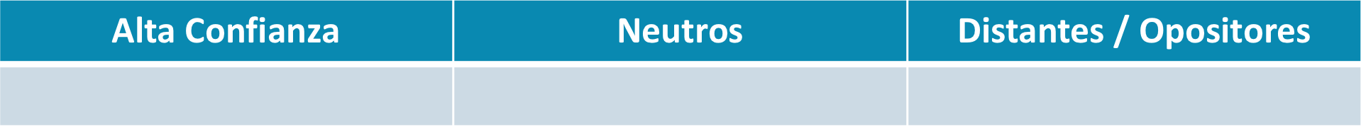 Continuamos entonces con el siguiente ejercicio: escriba en una columna los nombres de las personas en su trabajo con las cuales cuenta con una sólida cercanía y un vínculo como para considerarlos alguien de confianza. Luego escriba en la columna a la derecha los nombres de quienes están en una posición que podría llamarse “neutra” en relación a usted. Por último escriba en la tercera columna los nombres de las personas que se encuentran alejadas (por distancia o por conflictos) de su círculo de confianza: