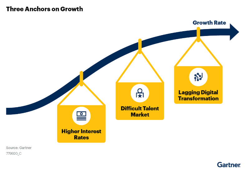 Las presiones económicas actuales están conduciendo a tres anclas en el crecimiento de 2023: tasas de interés más altas, un mercado de talentos difícil y una transformación digital rezagada (ver Figura 1).