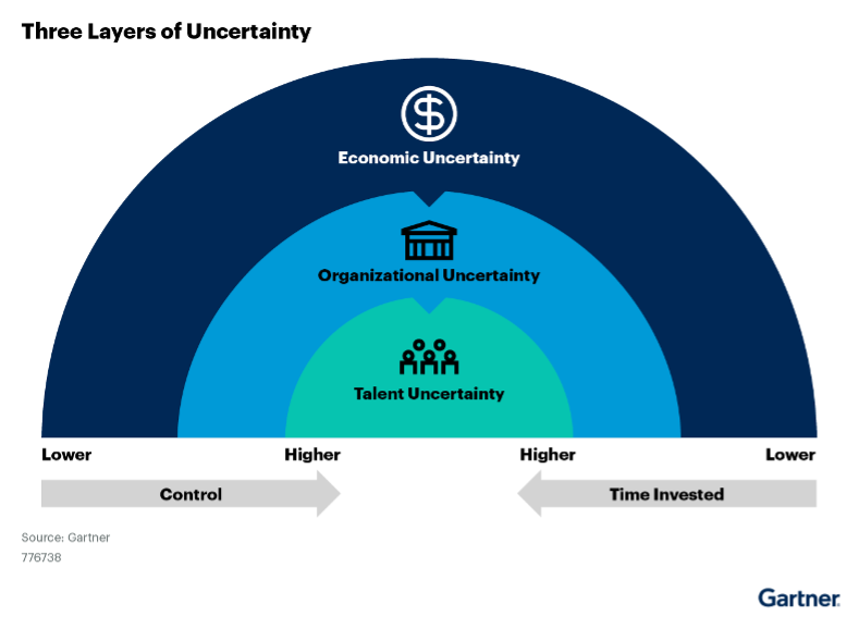 Específicamente, los líderes de recursos humanos pueden categorizar la incertidumbre que enfrentan en tres capas distintas (ver Figura 2):