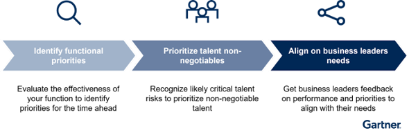 Priorice los aspectos no negociables del talento: los líderes de recursos humanos deben reconocer los posibles riesgos de talento que impedirán que las funciones de recursos humanos logren sus objetivos estratégicos. Es posible que enfrenten una mayor variedad de desafíos y no puedan enfrentarlos todos simultáneamente. Dar prioridad a los talentos no negociables ayudará a los líderes de recursos humanos a ejecutar al menos sus objetivos mínimos.
