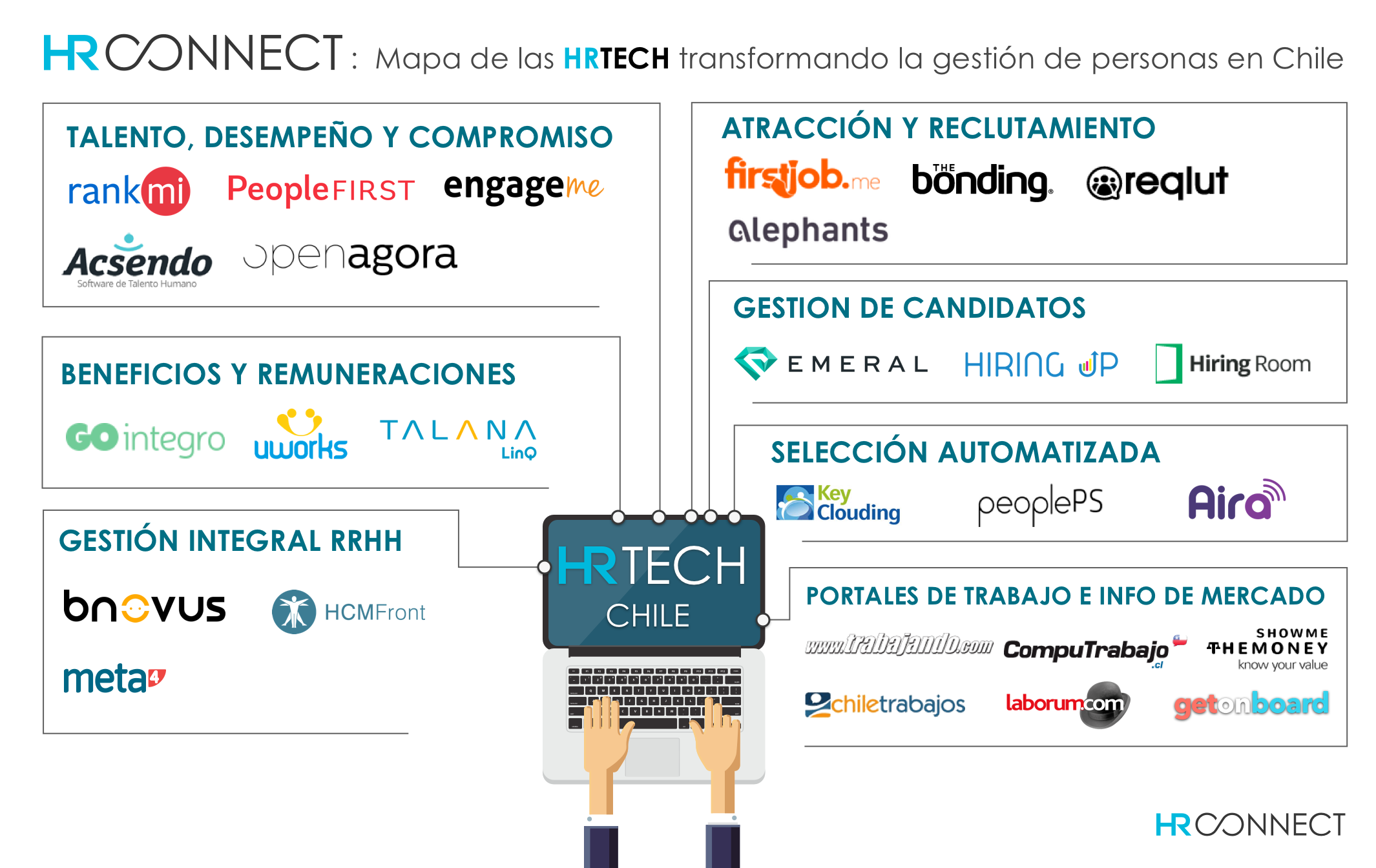 Te invitamos a conocer el primer mapa de las HR Tech en Chile , incluyendo servicios y tecnologías nacidas en Chile, así como también otras de Latinoamérica que ya han llegado al país.