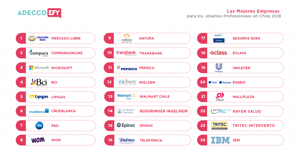 Eres un millennial buscando un gran lugar para trabajar? Buscas atraer al mejor talento jóven para tu empresa? Aquí te presentamos las mejores empresas para jóvenes profesionales, de la medición Adecco-Employers for Youth (EFY), realizado por la plataforma FirstJob y el grupo Adecco, que busca reconocer a las Mejores Empresas para los Jóvenes Profesionales, en la que participaron más de 9.000 jóvenes profesionales de 60 empresas.
