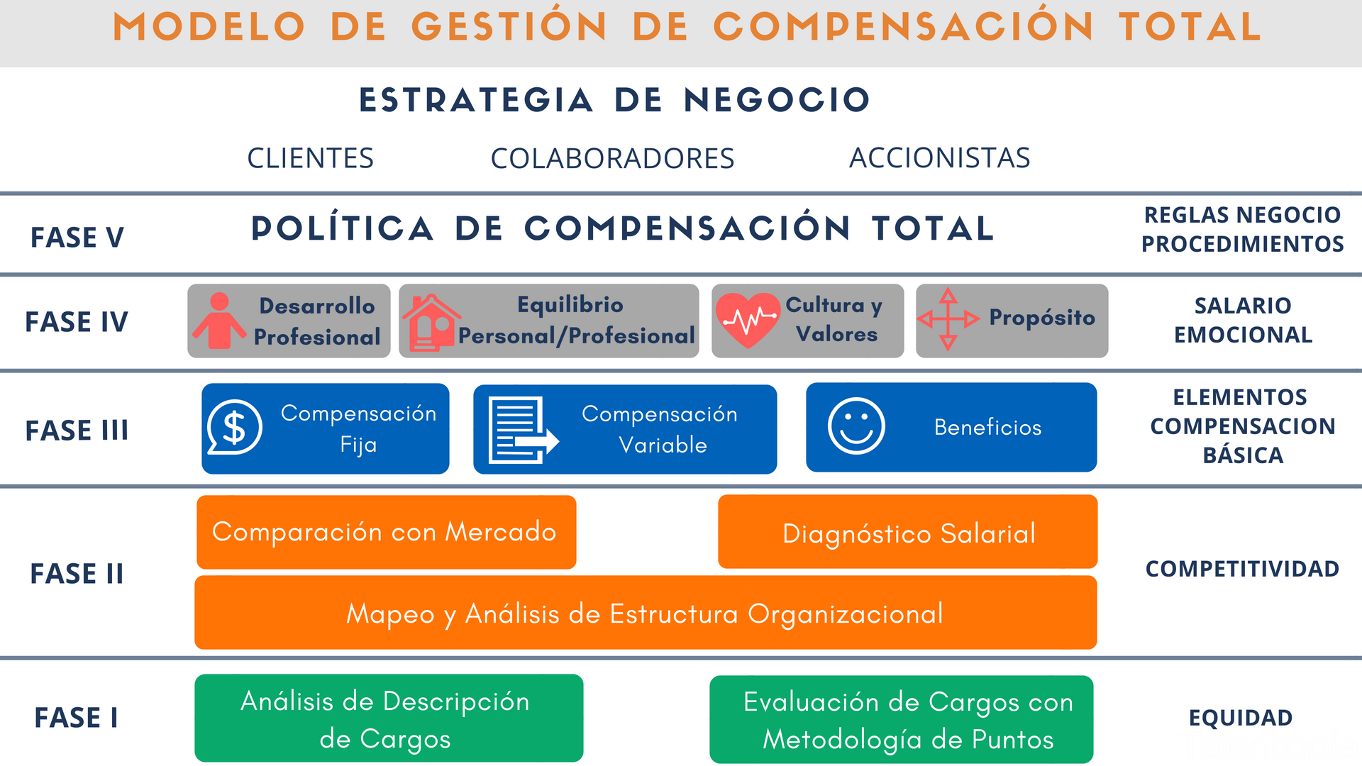 Una de las maneras más prácticas de comprender su impacto es entender que la compensación de un empleado puede estructurar en base a una metodología de 5 Fases que revisaremos a continuación.